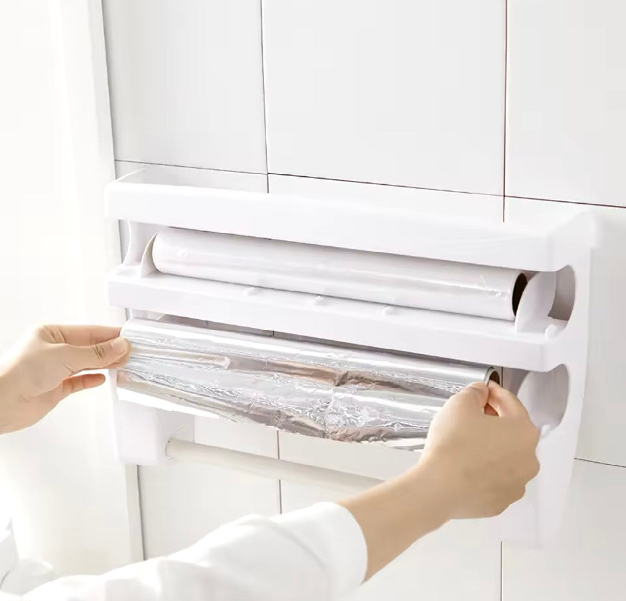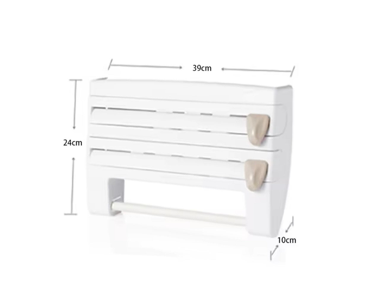 DISPENSADOR DE ROLLOS PARA COCINA, PARA PLÁSTICO STRETCH, PAPEL ALUMINIO, Y TOALLAS DE PAPEL, INCLUYE DOS CORTADORES DESLIZABLES.
