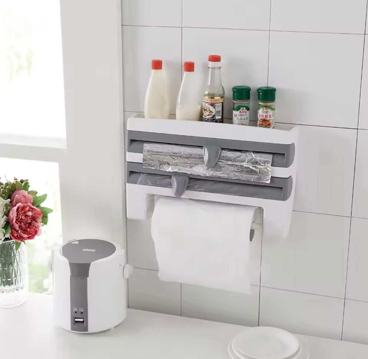 Espacio adicional en la parte superior para colocar frascos de especias o un rollo de recambio. Compartimientos individuales accesibles frontalmente, lo cual permite cambiar los rollos fácilmente. Rollos no incluidos. Fácil de colocar en la pared, piezas de fijación incluidas. Incluye instrucciones.