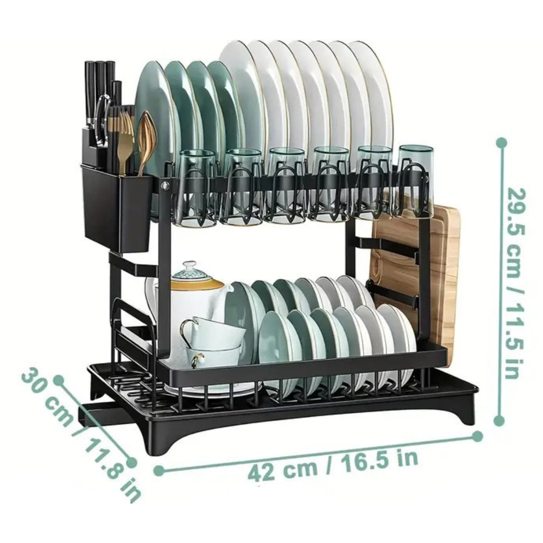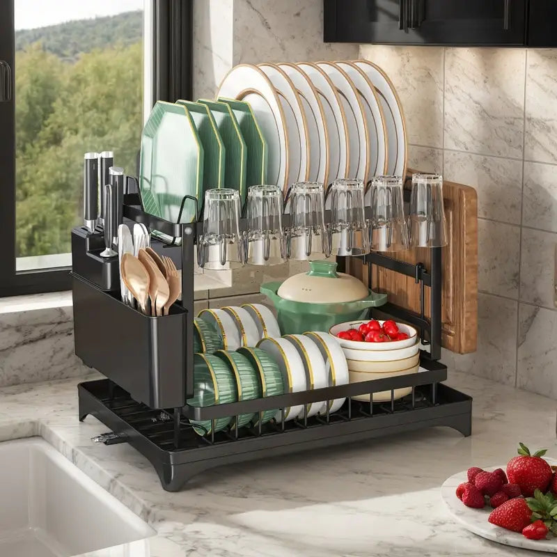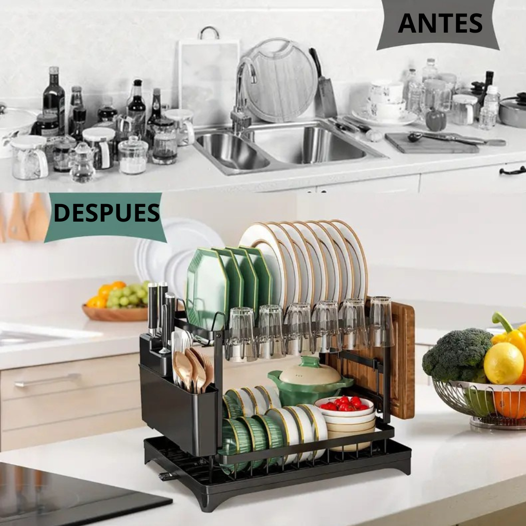 3. Limpio y ordenado: Mantenga sus platos limpios y ordenados con este escurridor de platos que utiliza espacio tridimensional para ahorrar espacio en su cocina. Tiene una tabla de drenaje desmontable y una boquilla giratoria de 360° para un fácil drenaje del agua.