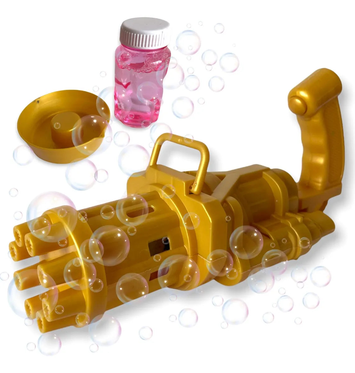 Lanza burbujas con forma de pistola ametralladora, consta de un ventilador y varios agujeros ¿Cómo funciona? Sólo agrega un poco de líquido de burbujas al pote incluido y sumerge los agujeros en el líquido, luego sólo enciende con el botón de la pistola y lanzará muchas burbujas!
