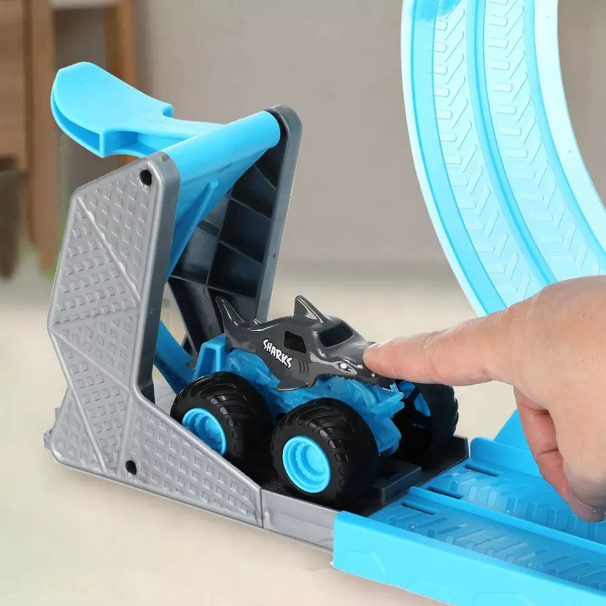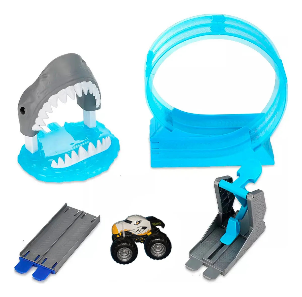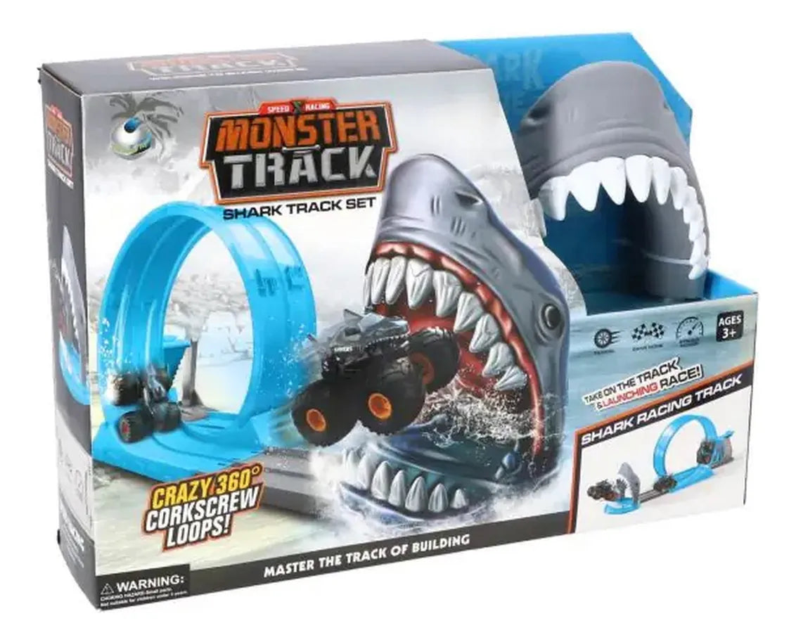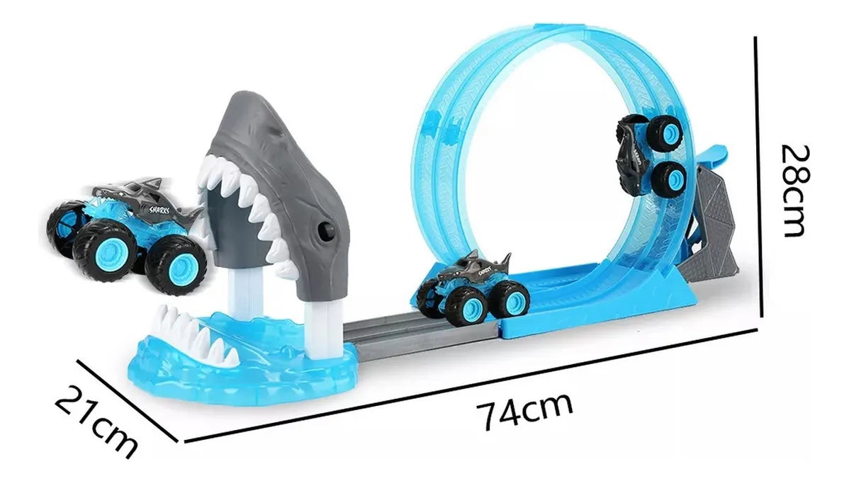 Pista de tiburón acompañada de un carro que es movido por medio de una catapulta, siendo un juguete de piezas armables que permitirá a los niños (a) desarrollar su imaginación e intelecto, su memoria para el armado y desarmado de esta figura.