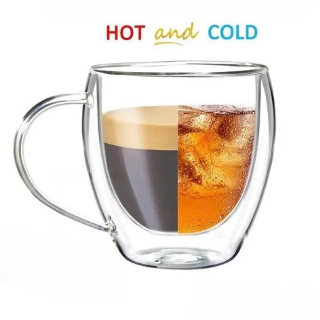 La doble pared en vidrio con diseño contemporáneo, cuya estructura que genera un vacío en el medio que evita la condensación y la transferencia de calor hacia el exterior del recipiente, manteniendo las bebidas calientes o frías, por un tiempo prolongado.