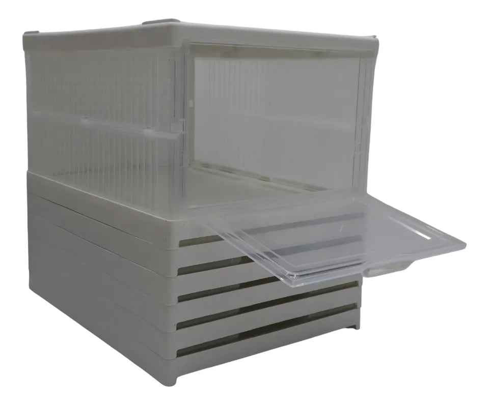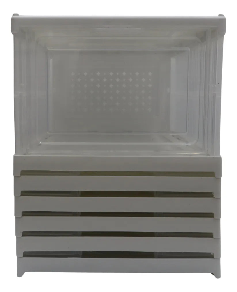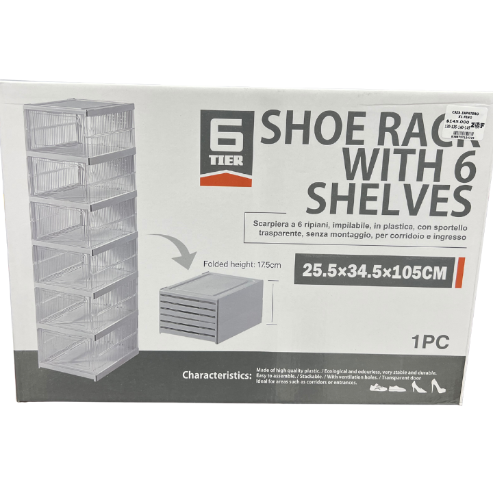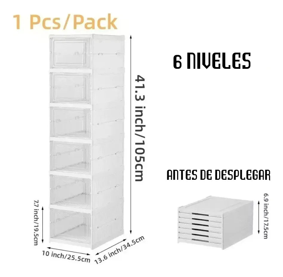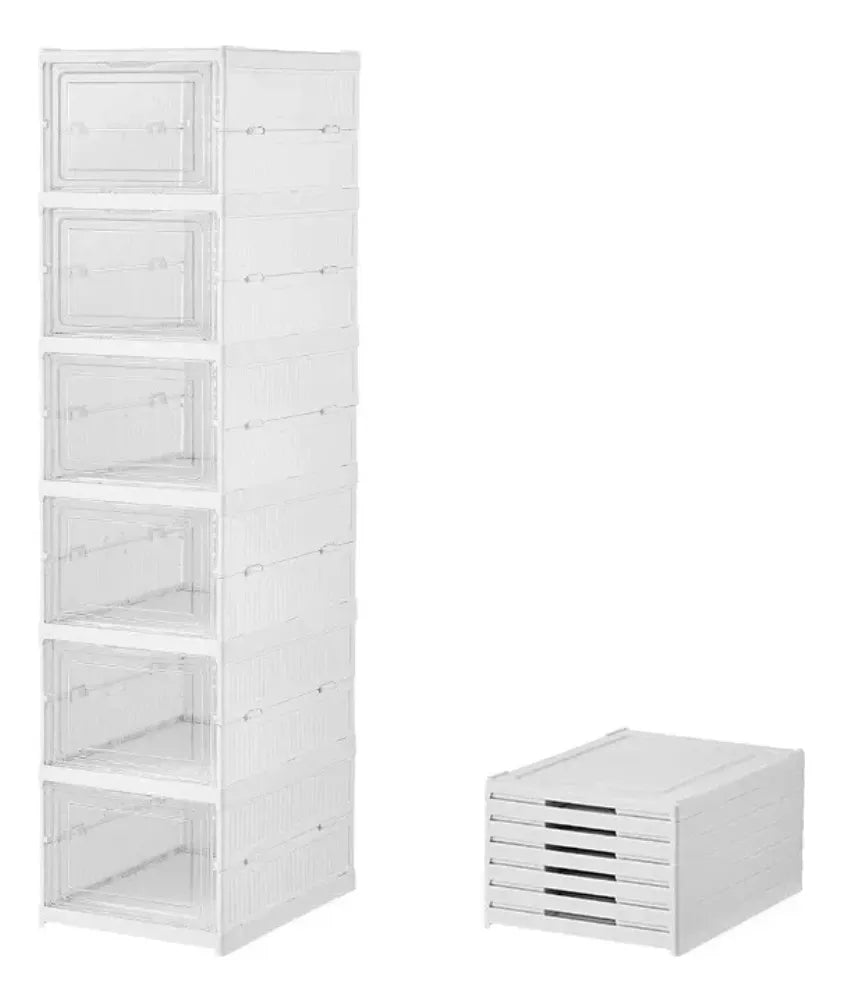 Fabricado en plástico reforzado, este estante es ligero y resistente, permitiendo almacenar hasta 6 pares de zapatos en sus 6 estantes tipo caja con puerta transparente. Su diseño plegable facilita su almacenamiento cuando no está en uso, lo que lo convierte en una opción versátil para quienes buscan maximizar su espacio.